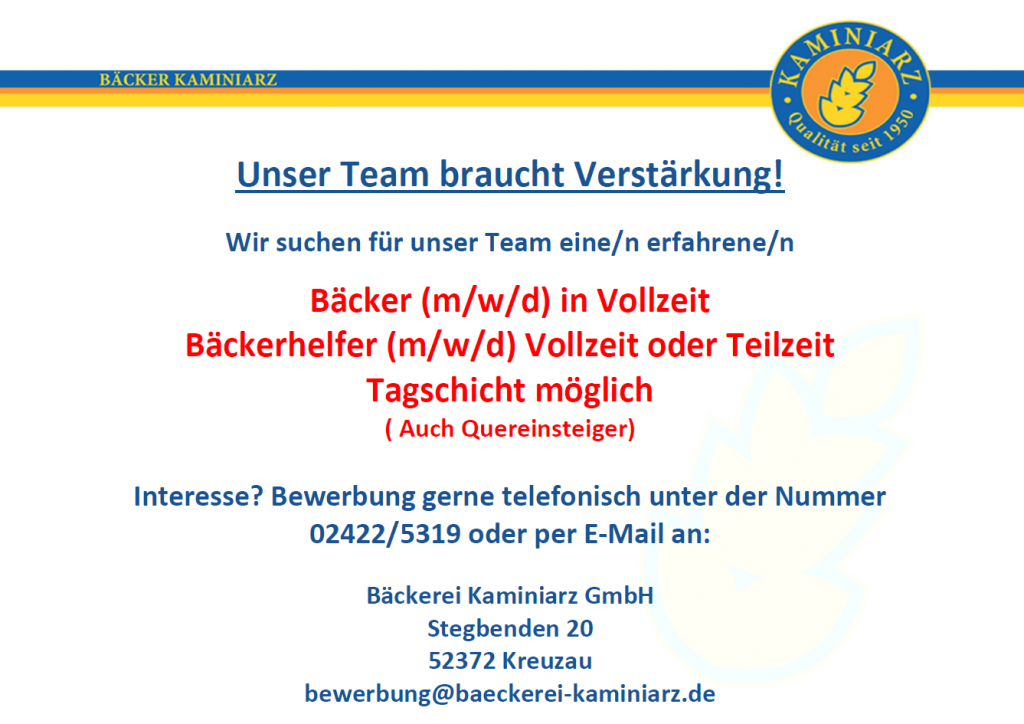 Wir sind immer auf der Suche nach motivierten Kolleginnen und Kollegen, die das Bäckerhandwerk genauso lieben wie wir. Du hast Lust, Teil der Kaminiarz-Familie zu werden und unseren Kunden den Tag mit frischen und leckeren Backwaren zu versüßen? Dann freuen wir uns auf Deine Bewerbung per E-Mail an bewerbung@baeckerei-kaminiarz.de oder per Post an Bäckerei Kaminiarz, Stegbenden 20, 52372 Kreuzau.